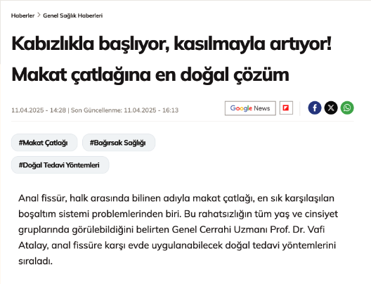 Röportajın tamamını okumak için aşağıdaki linke tıklayabilirsiniz: https://www.milliyet.com.tr/pembenar/galeri/kabizlikla-basliyor-kasilmayla-artiyor-makat-catlagina-en-dogal-cozum-7348731/2